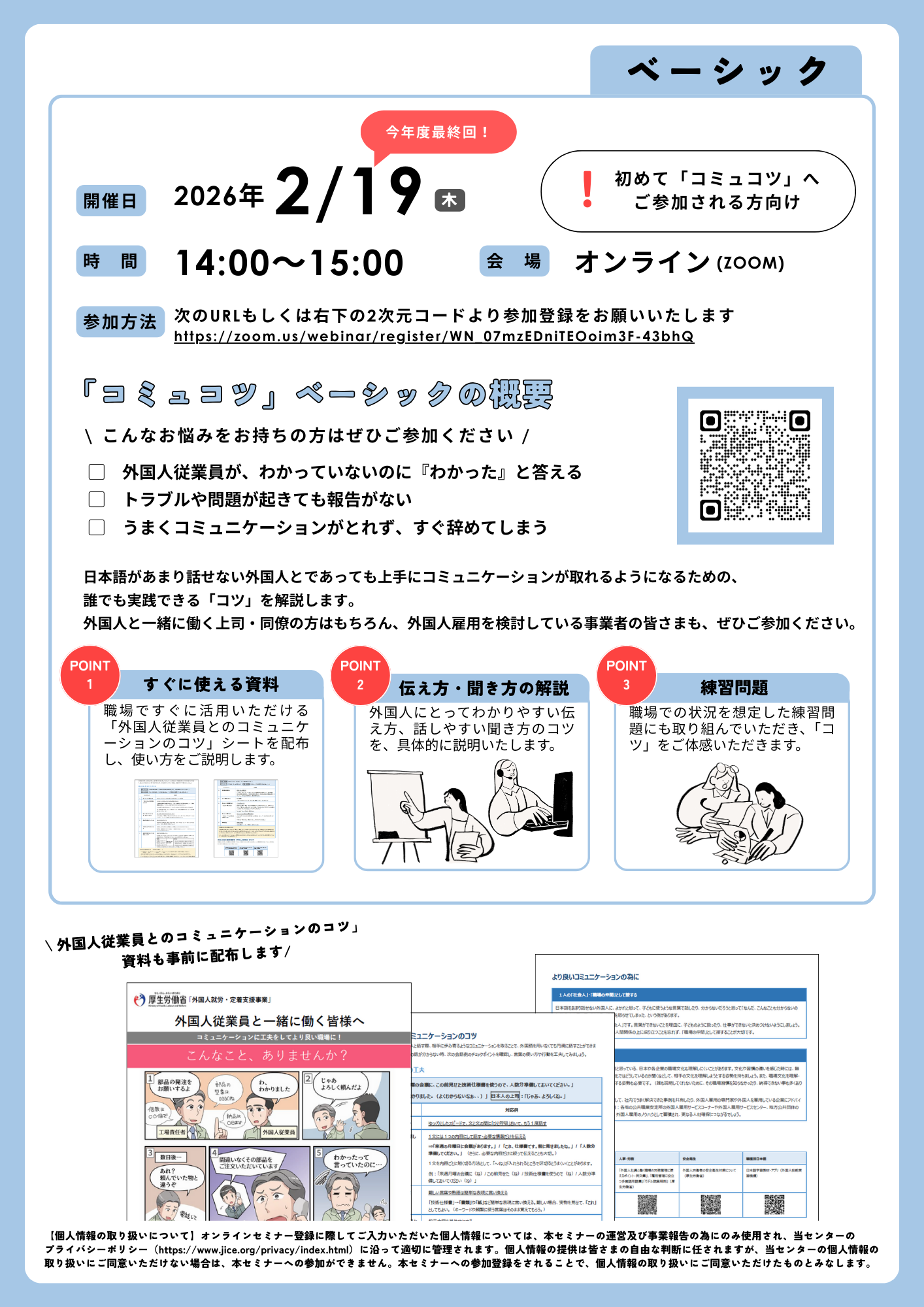 JICEでは、厚生労働省受託事業「外国人就労・定着支援事業」の一環として、外国人従業員を雇用する、または雇用を検討中の事業者の皆様に向けた2種類の無料オンラインセミナーを開催します。