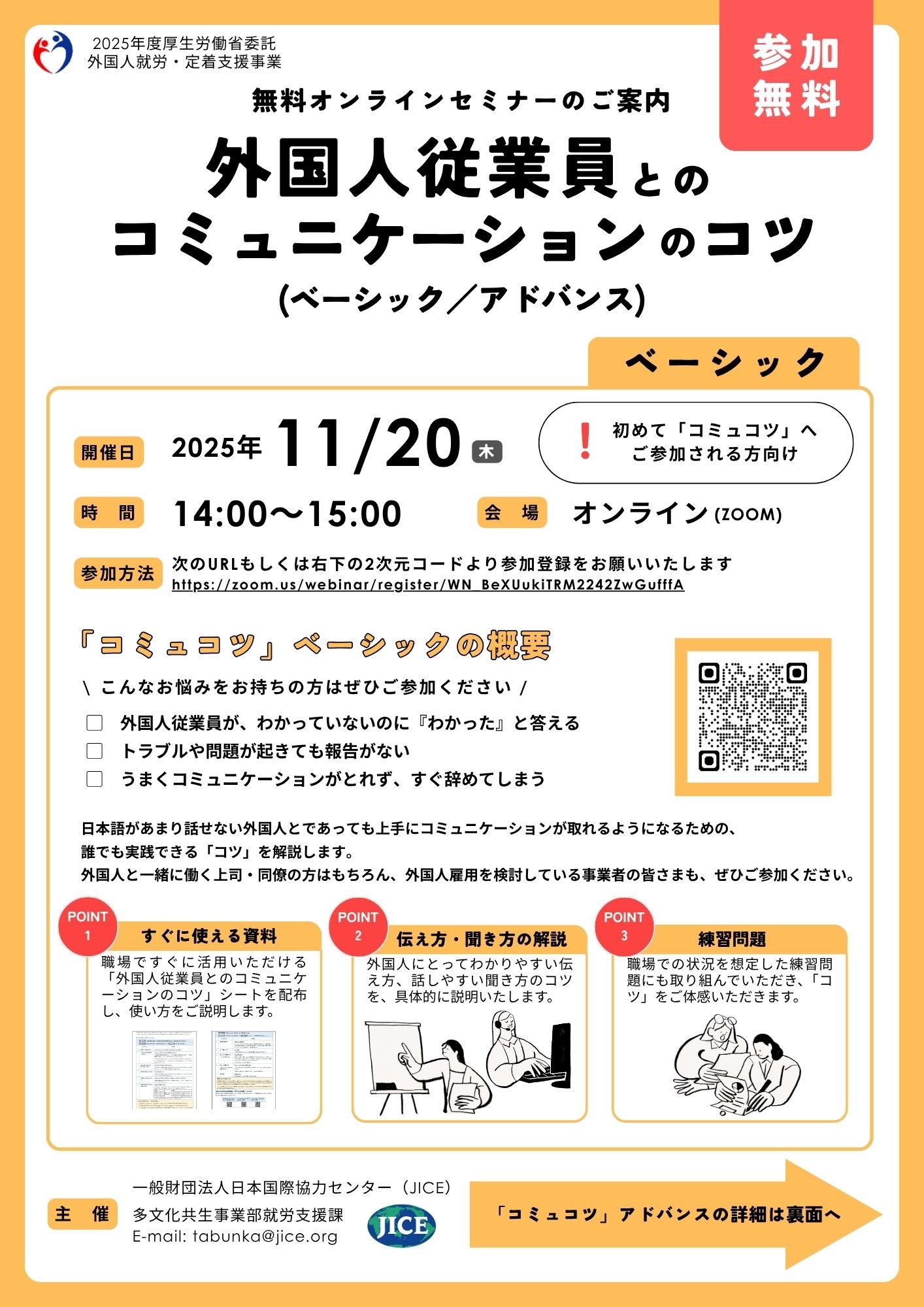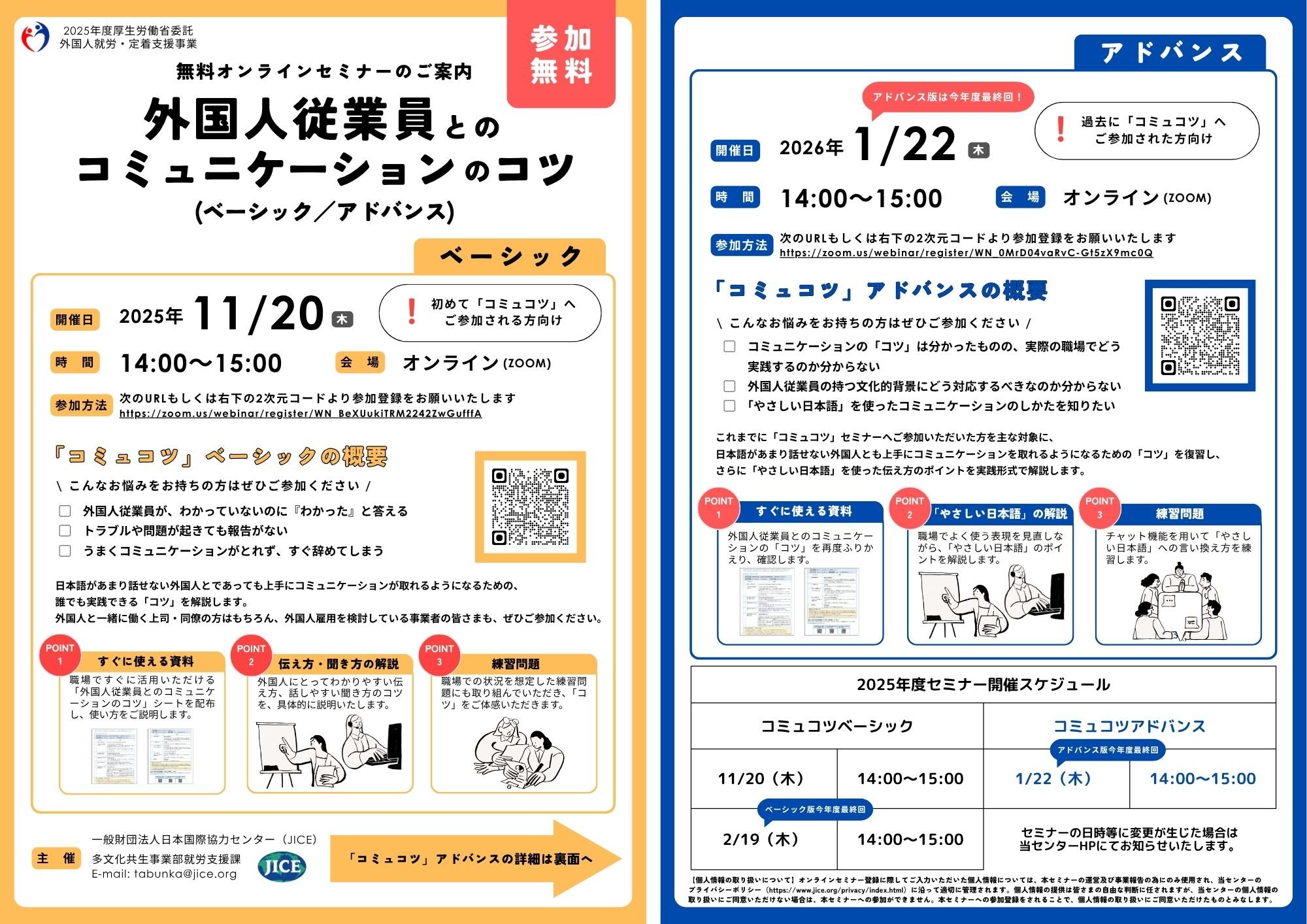 JICEでは、厚生労働省受託事業「外国人就労・定着支援事業」の一環として、外国人従業員を雇用する、または雇用を検討中の事業者の皆様に向けた2種類の無料オンラインセミナーを開催します。