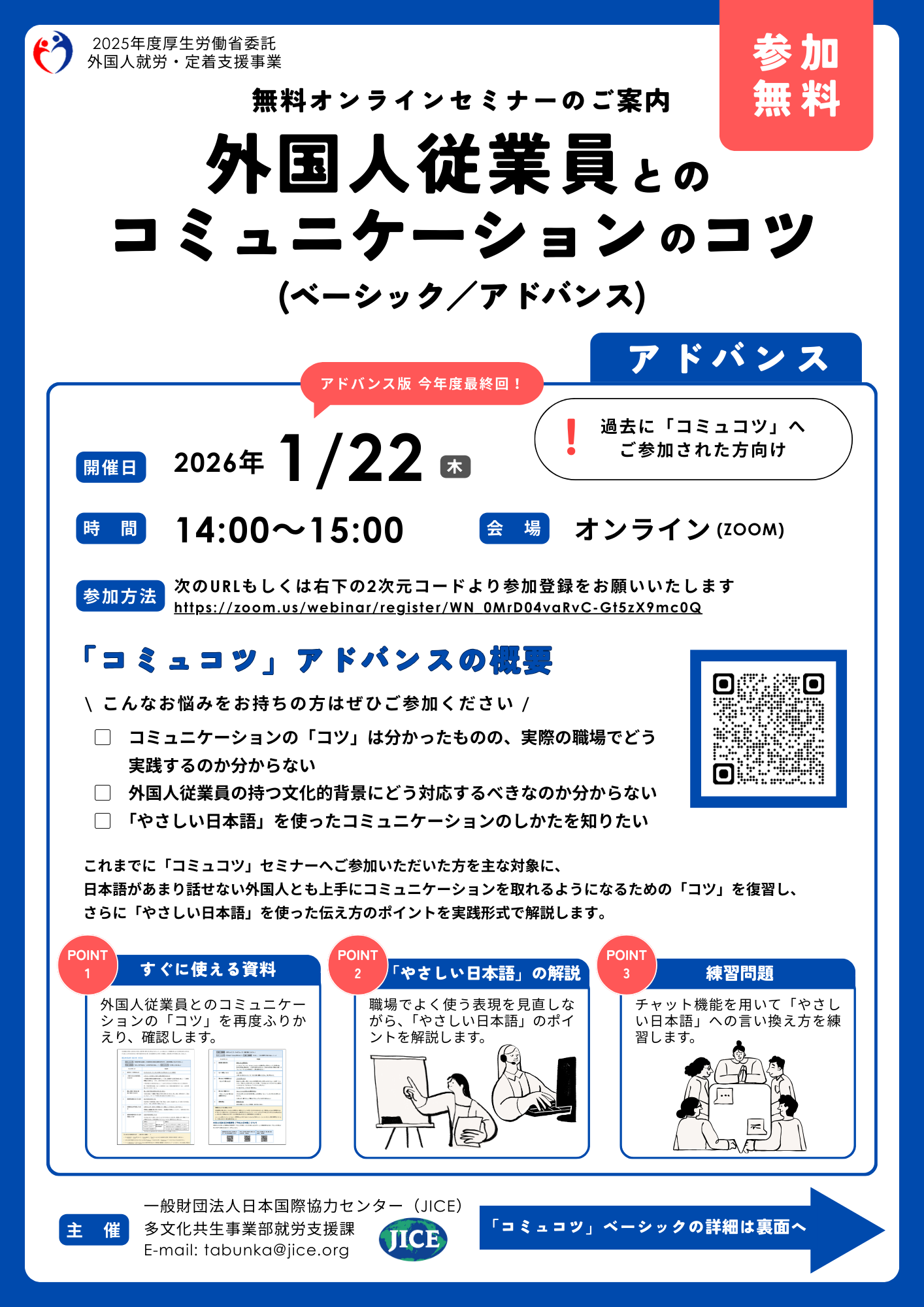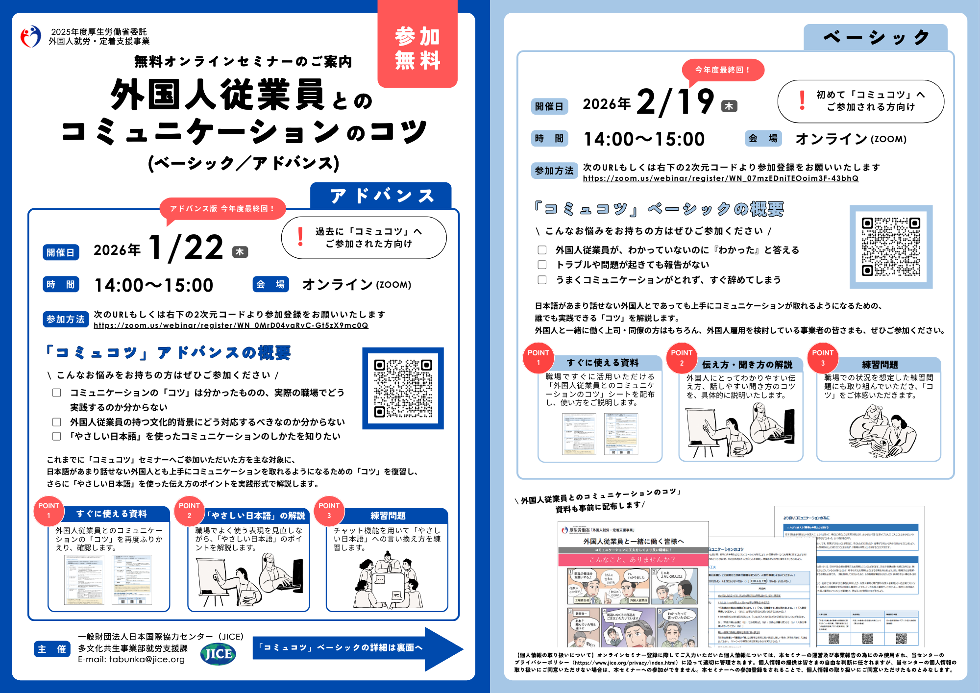JICEでは、厚生労働省受託事業「外国人就労・定着支援事業」の一環として、外国人従業員を雇用する、または雇用を検討中の事業者の皆様に向けた2種類の無料オンラインセミナーを開催します。